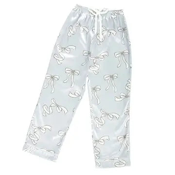 Blue Satin Pajama Set – White Bow Print with Velvet Waistband Ties